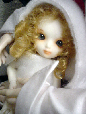 玖愔.... 為什麼你的腳那麼大呢orz 明明問了賣家,賣家也說13SD可以穿 可是玖愔就是穿不進去啊>< 難道是我塞的方法錯了...@@ 跑去買了娃娃用的頭髮想說幫小兔兔做假髮 可是手工藝店沒有賣髮排 只有賣一條一條的捲髮 我縫到一半就全部纏在一起 加上不小心把頭套做的太小了不夠緊 只好放棄了.... 把縫壞的地方遮起來XD