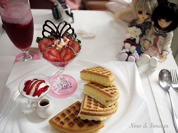 因為快中午時才吃了早餐(初次嘗試的披薩吐司>v<)所以只點了草莓鬆餅加飲料
